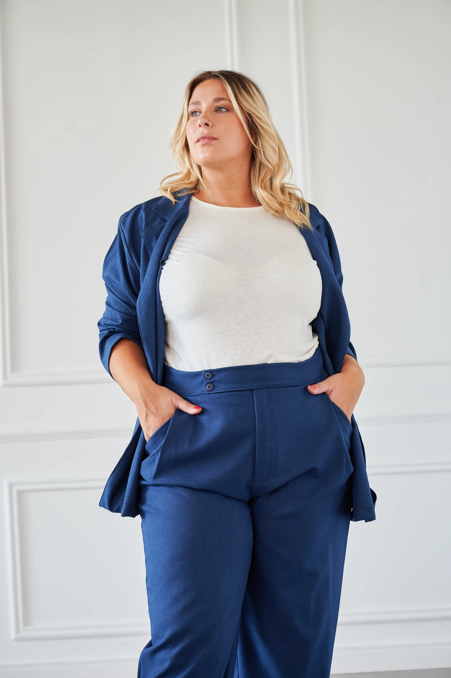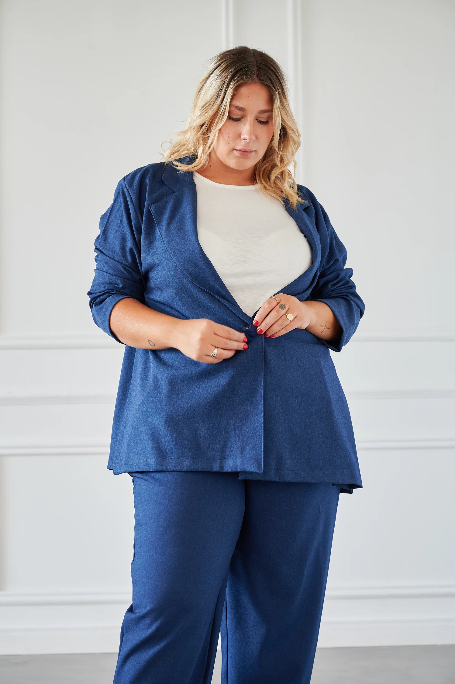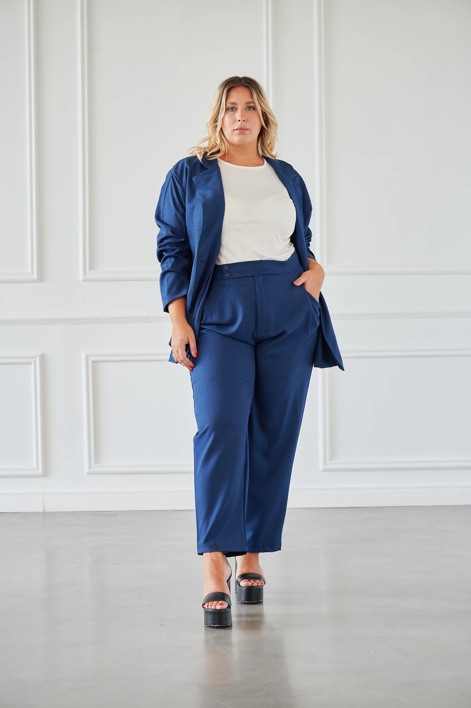 Blazer de sarga con corte oversize que aporta estructura y elegancia en su versión más contemporánea. El oversize no es descuidado sino intencional: silueta amplia en hombros y manga larga que estiliza la figura. Ideal como pieza de autoridad en cualquier outfit.