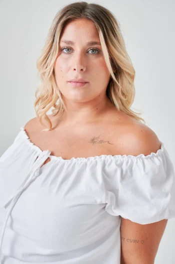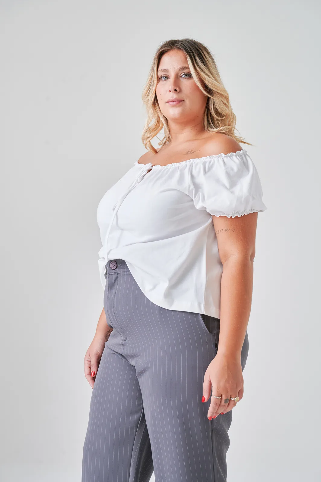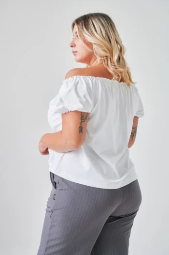 Blusa con elástico en el escote y lazo para atar. El elástico en el escote crea un efecto de hombros descubiertos o semi-descubiertos regulable por la usuaria según la ocasión. El lazo aporta un toque romántico y femenino que convierte esta blusa en una pieza especial.