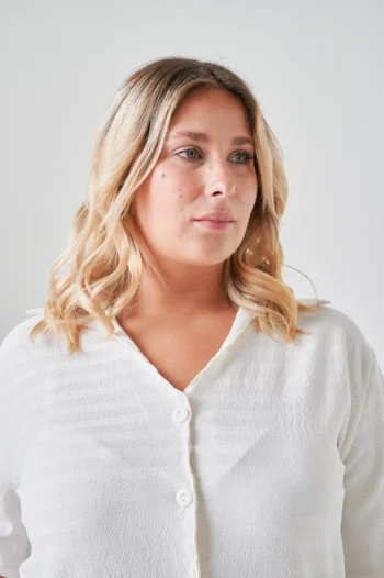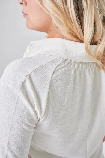 La Camisa FUYU tiene ese detalle que la hace especial: el frunce en la espalda aporta movimiento y textura visual en la zona posterior, transformando una camisa de manga corta en algo con carácter propio. El crepe texturado resiste el uso intensivo sin arrugarse ni perder forma. En amarillo, blanco, latte y negro, cuatro colores que van del clásico al color de temporada. Una camisa que llama la atención en el perchero y convence en el probador.