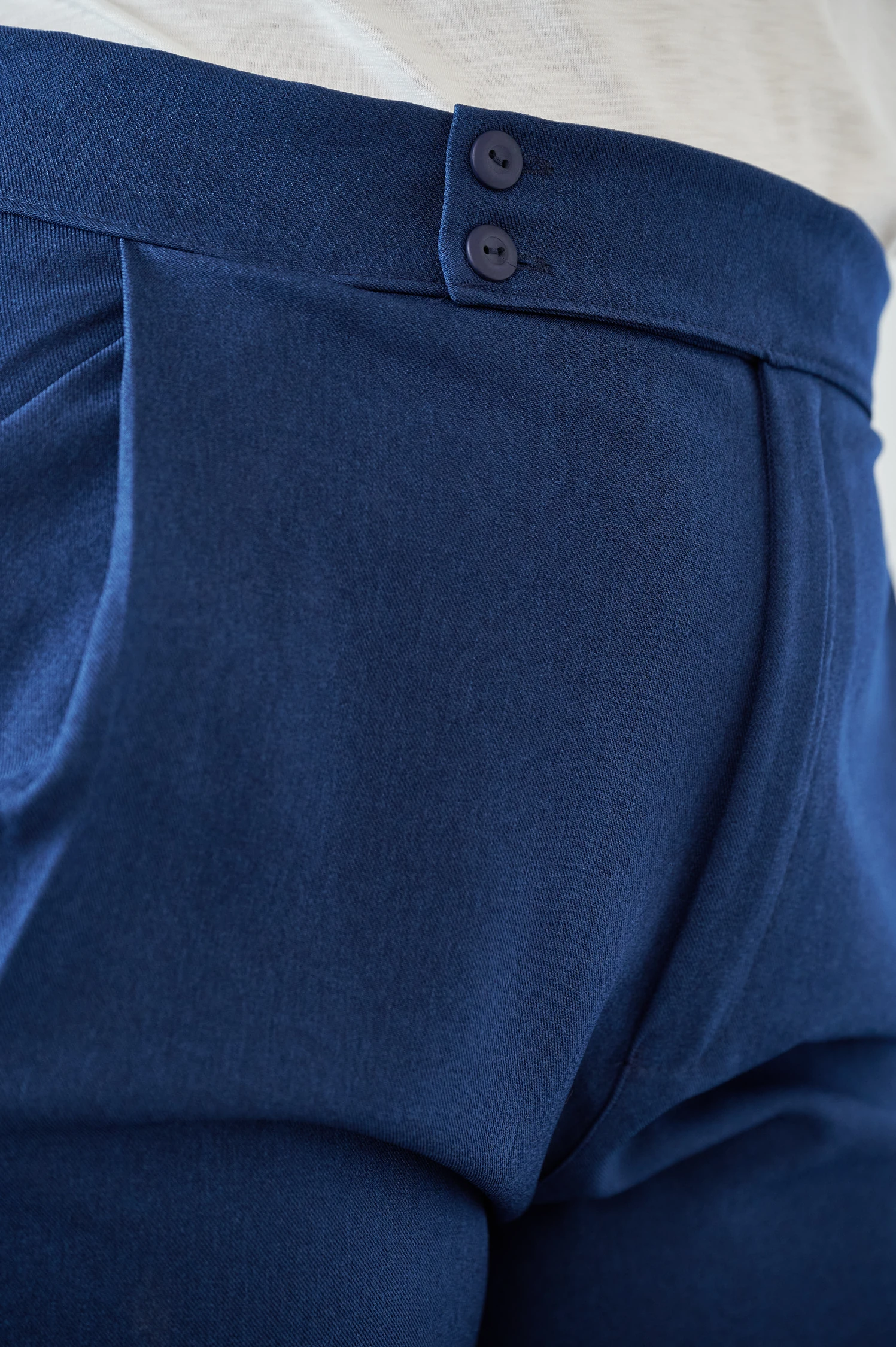 Pantalón de sarga con corte sastrero, tablas delanteras y bolsillos laterales. Las tablas aportan amplitud en cadera y muslo sin perder la elegancia del corte formal. Los bolsillos funcionales completan un diseño que equilibra estética y practicidad.