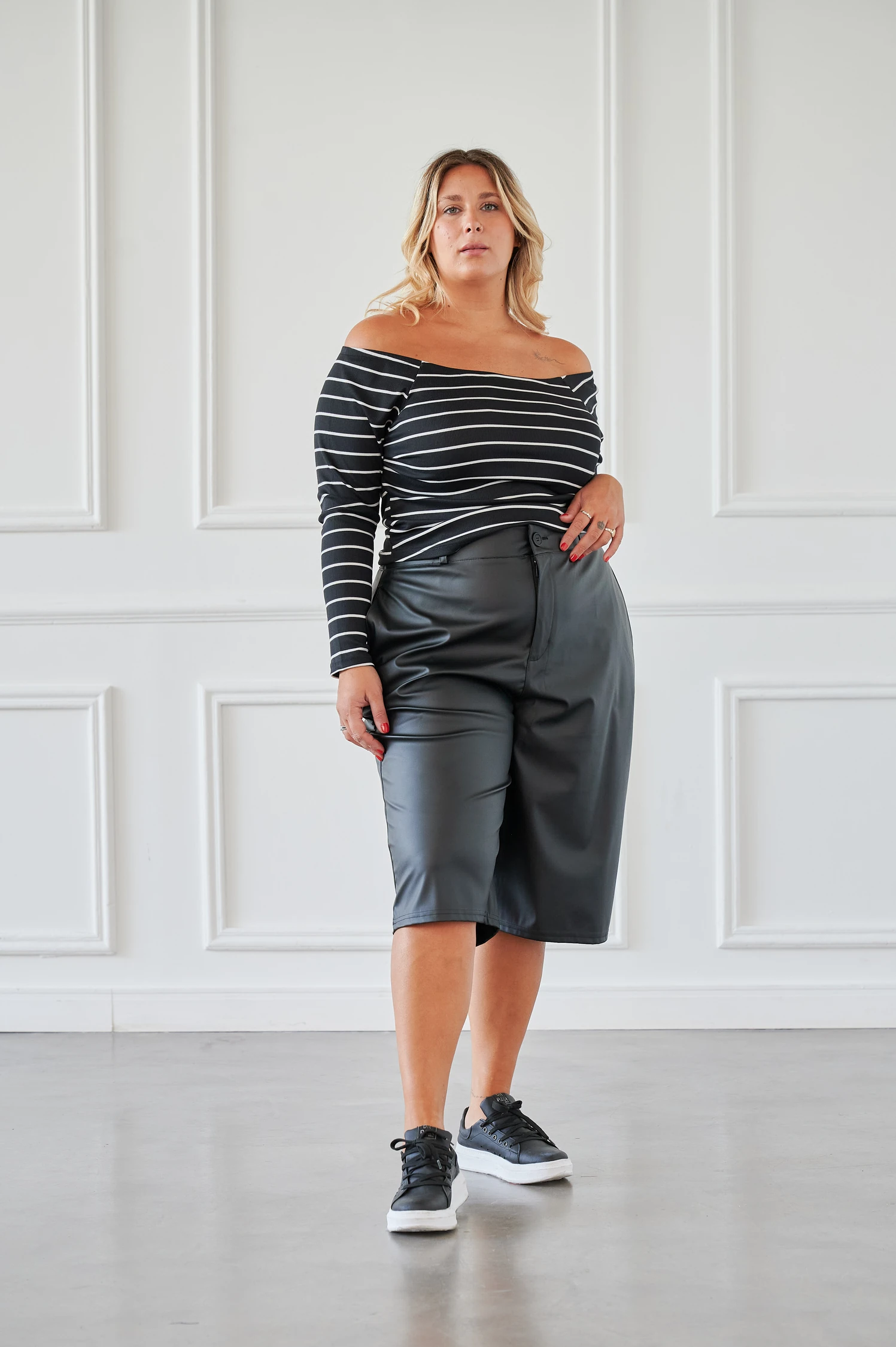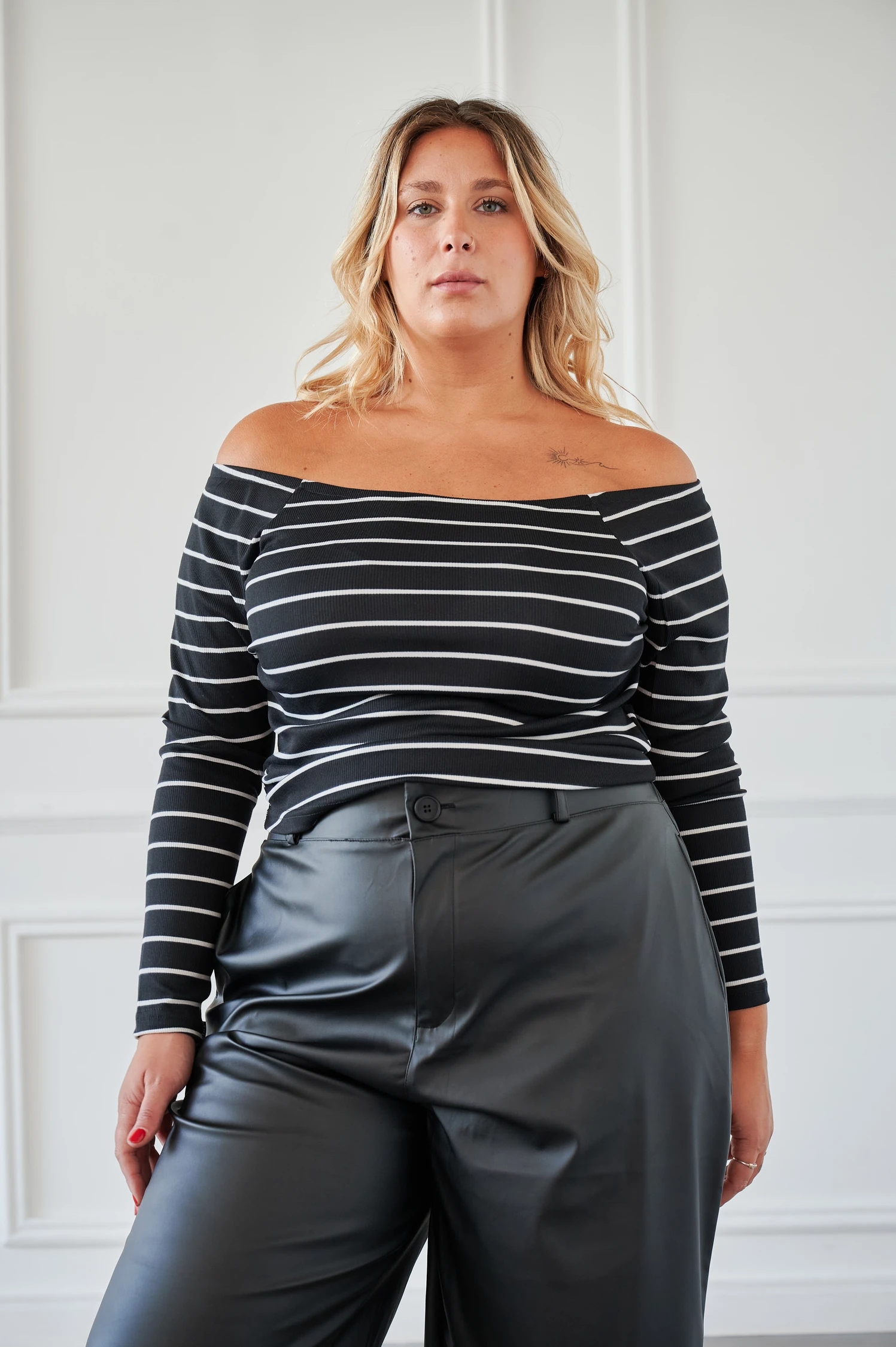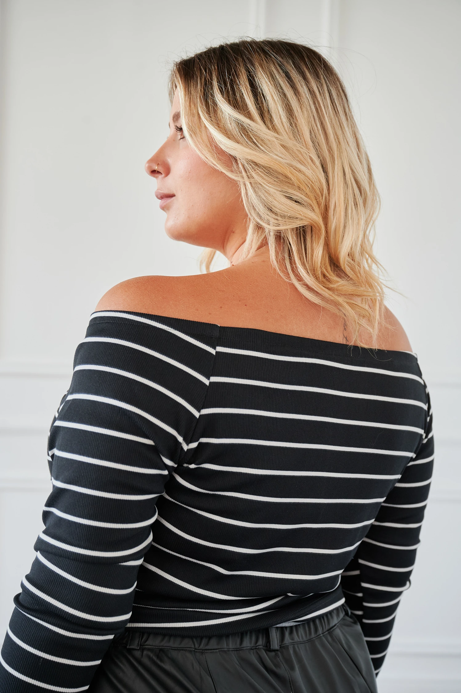 Remera de morley rayado con cuello bote y mangas largas. El cuello bote es un escote horizontal que realza los hombros y el cuello. El morley rayado agrega movimiento visual y textura a un diseño clásico. Una prenda base que eleva el look con solo ponérsela.
