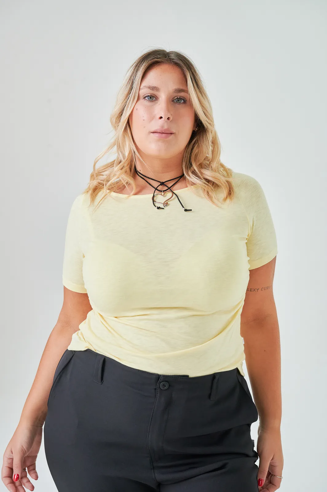 La remera AZAHAR de Entro Talles Grandes está confeccionada en jersey y lleva frunces laterales que generan volumen controlado sobre los costados. A diferencia de la TANI —que trabaja la sisa— la AZAHAR frunce