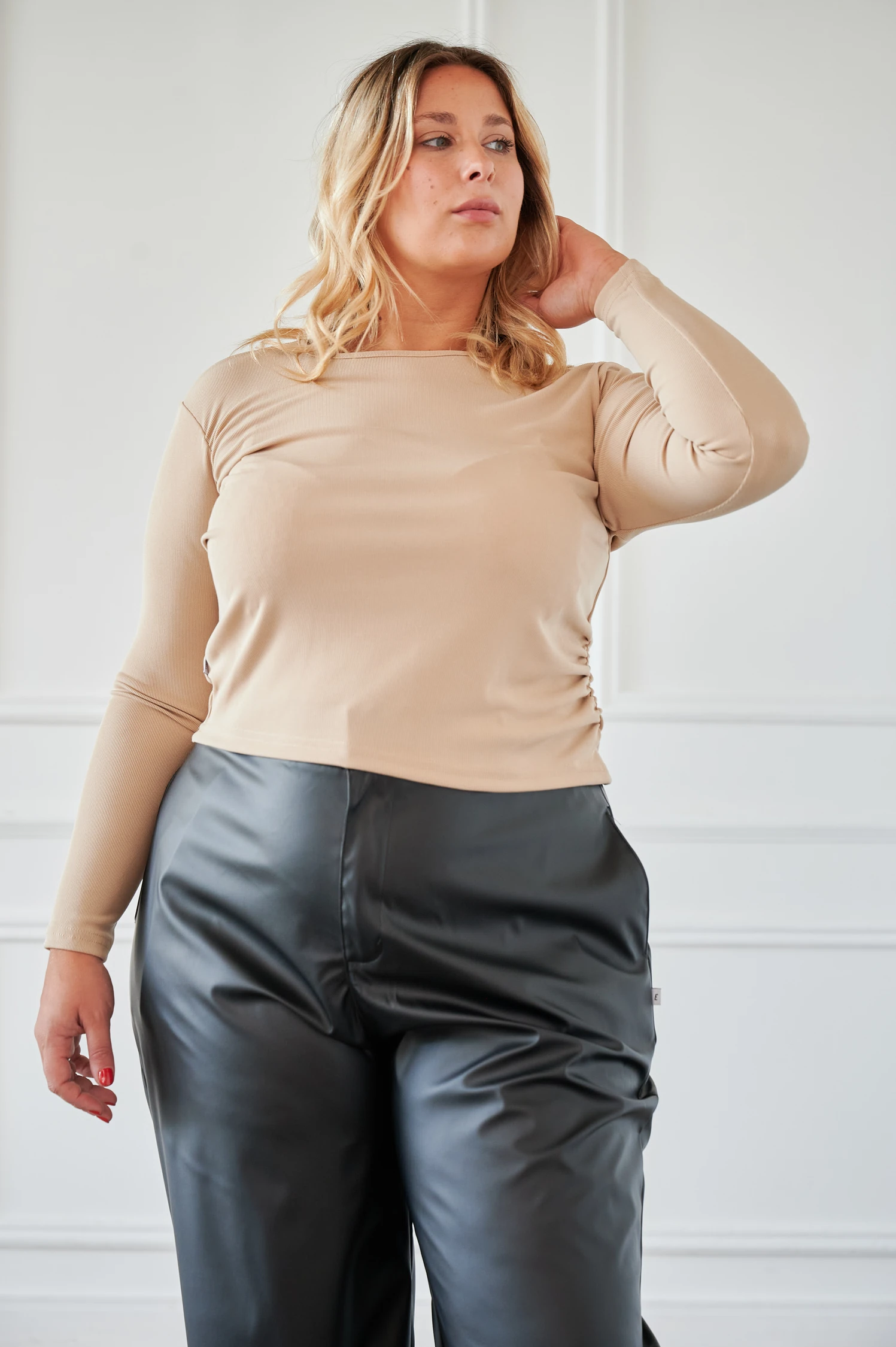 Remera de morley con mangas largas que incluyen frunces en la sisa y el lateral. Estos frunces crean volumen estratégico en los detalles, dando movimiento y originalidad a una remera aparentemente sencilla. Disponible en tonos otoñales que complementan la temporada.