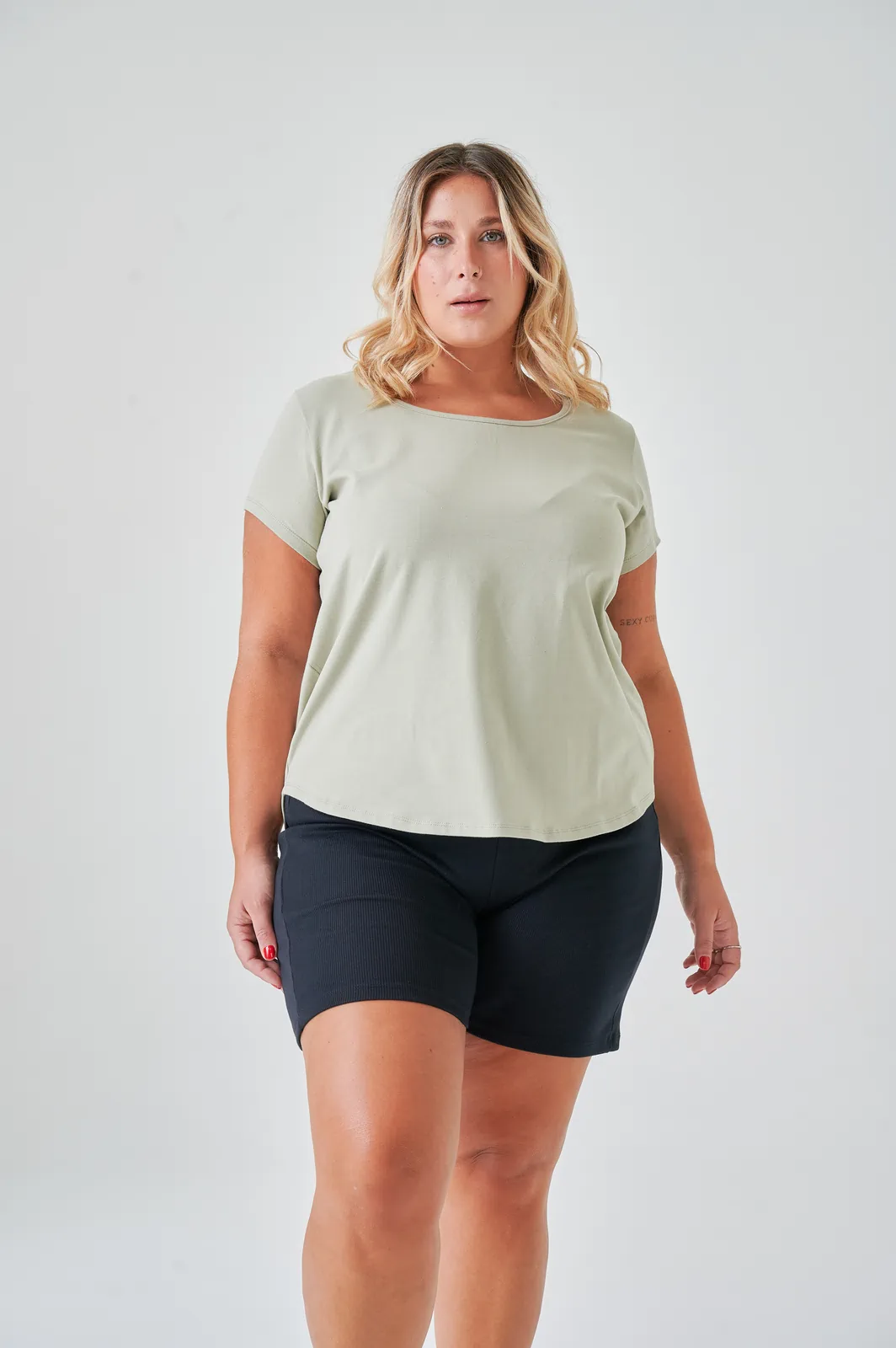 La Remera MAXIMA resuelve un problema cotidiano: la remera que queda bien de frente pero no cubre lo suficiente por detrás. Su espalda larga la convierte en una opción ideal para usar con calzas o jeans. El algodón con lycra asegura comodidad y moldeado sin rigidez. En blanco, choco, negro y verde —cuatro colores que se venden todo el año— es una de esas prendas que siempre tiene demanda.