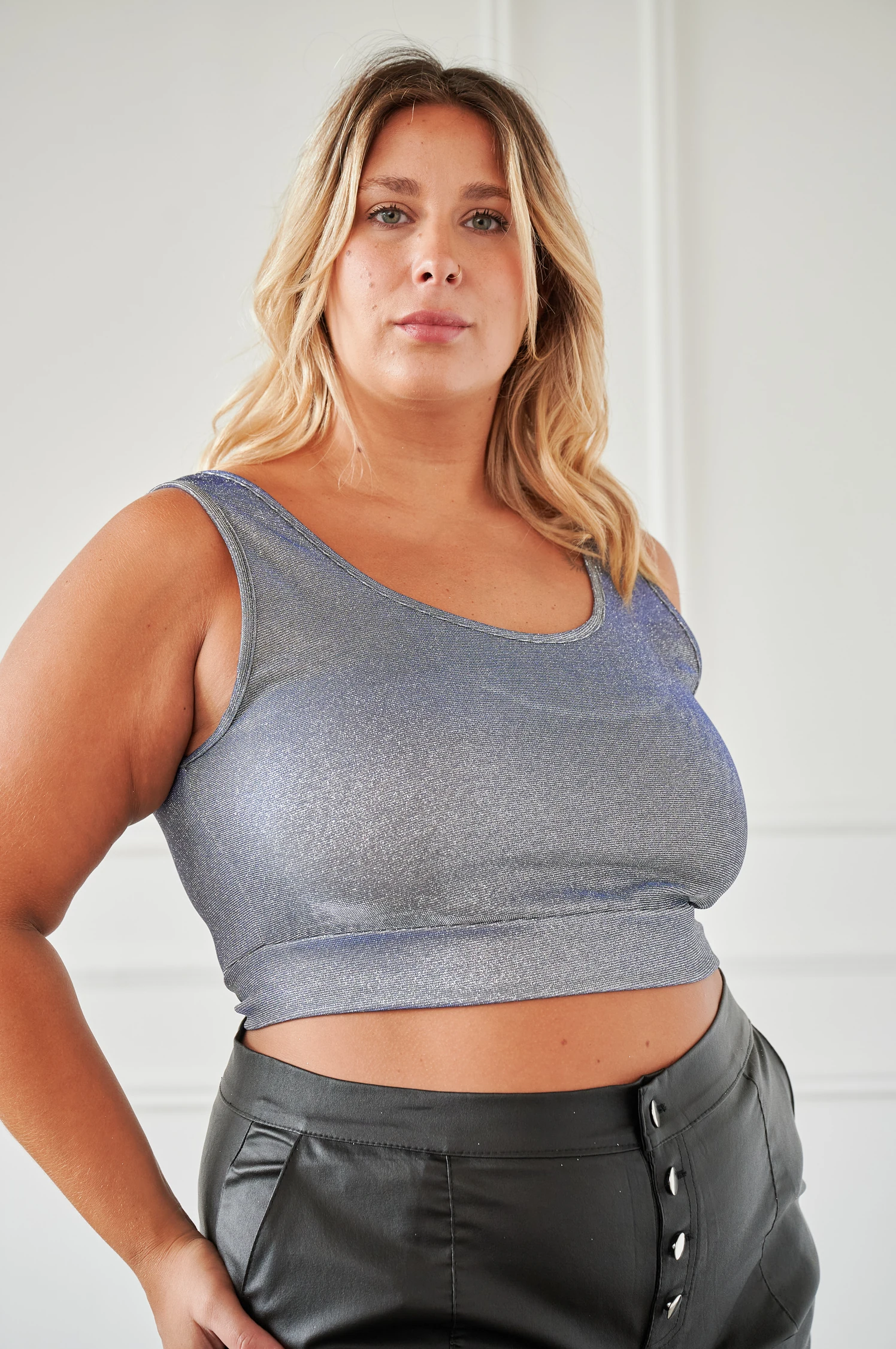 El Top NATALIA es la prenda de noche que ningún local de talles grandes debería dejar de tener: el glitter captura la luz y transforma el look al instante, y la cintura marcada define la silueta de manera favorecedora. En azul y negro —dos opciones que cubren distintos perfiles de clientas— es el top ideal para salidas nocturnas, fiestas y eventos. Difícil de conseguir en talles grandes con esta terminación y calidad.