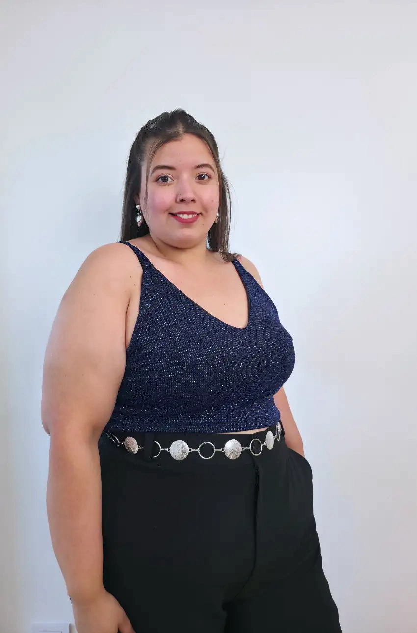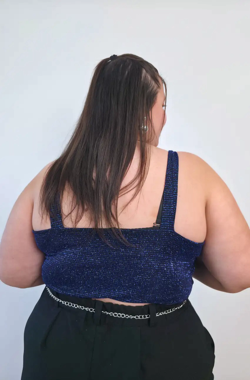 Top con brillo y bretel ancho, completamente forrado. Ideal para un look moderno y sofisticado, ofreciendo comodidad y soporte con su diseño de tiras anchas.