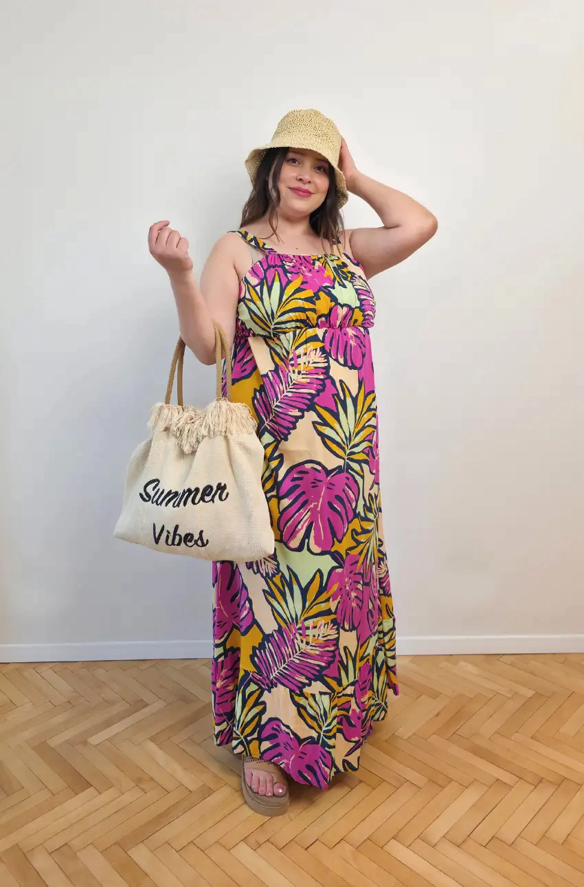 Vestido confeccionado en fibrana suave y liviana, con un diseño de breteles y espalda ancha que incorpora un elástico medio para un calce cómodo y favorecedor.